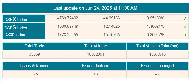 সূত্র মতে, আজ ডিএসইর লেনদেন শুরুর প্রথম ঘণ্টায় অর্থাৎ বেলা ১১ টা পর্যন্ত ডিএসইর প্রধান সূচক বা ‘ডিএসইএক্স’ ৪৪ দশমিক ৬৯ পয়েন্ট বেড়ে অবস্থান করছে ৪ হাজার ৭৩৯ পয়েন্টে।
