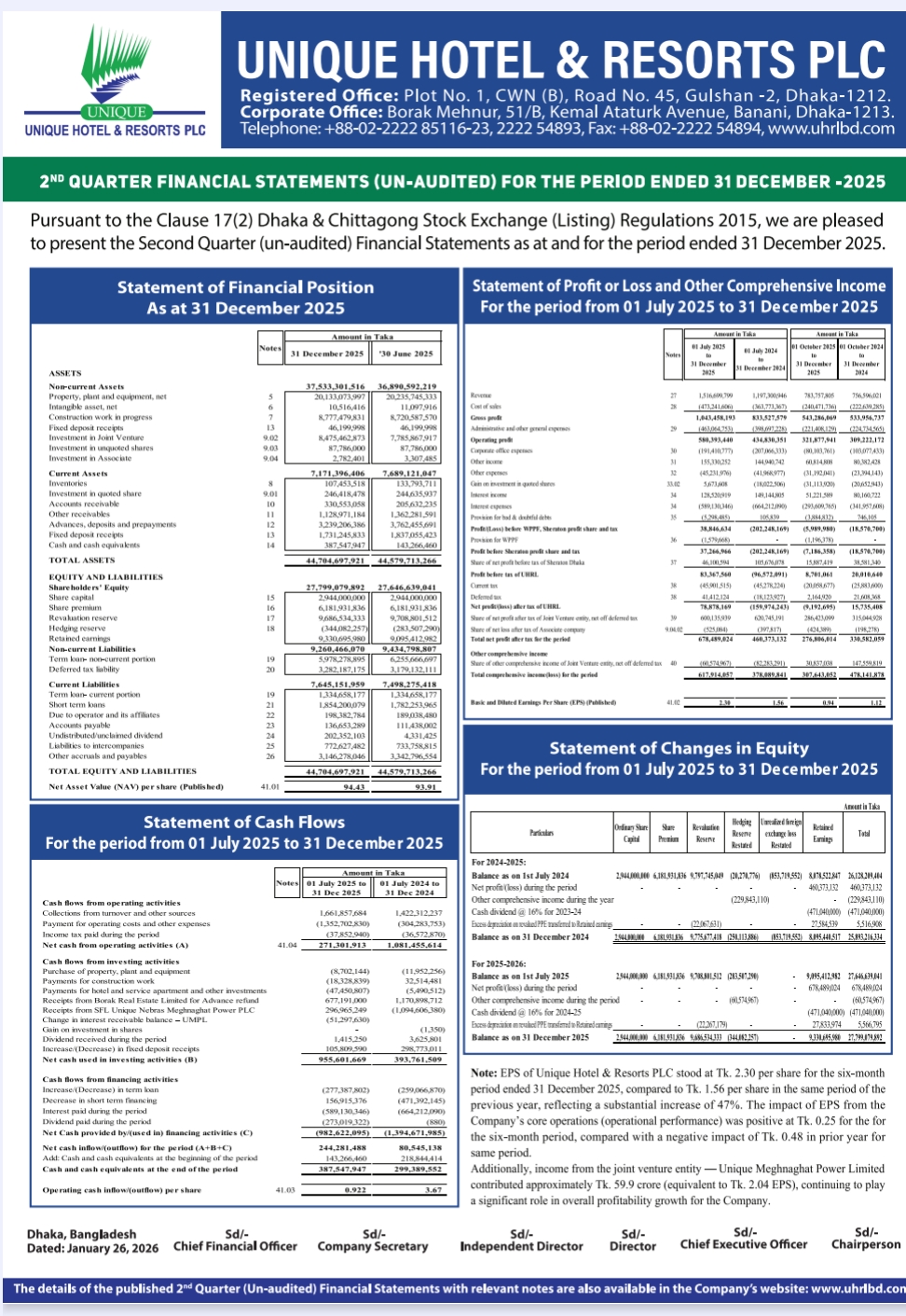 Second Quarter (un-audited) Financial Statements of UNIQUE HOTEL & RESORTS PLC