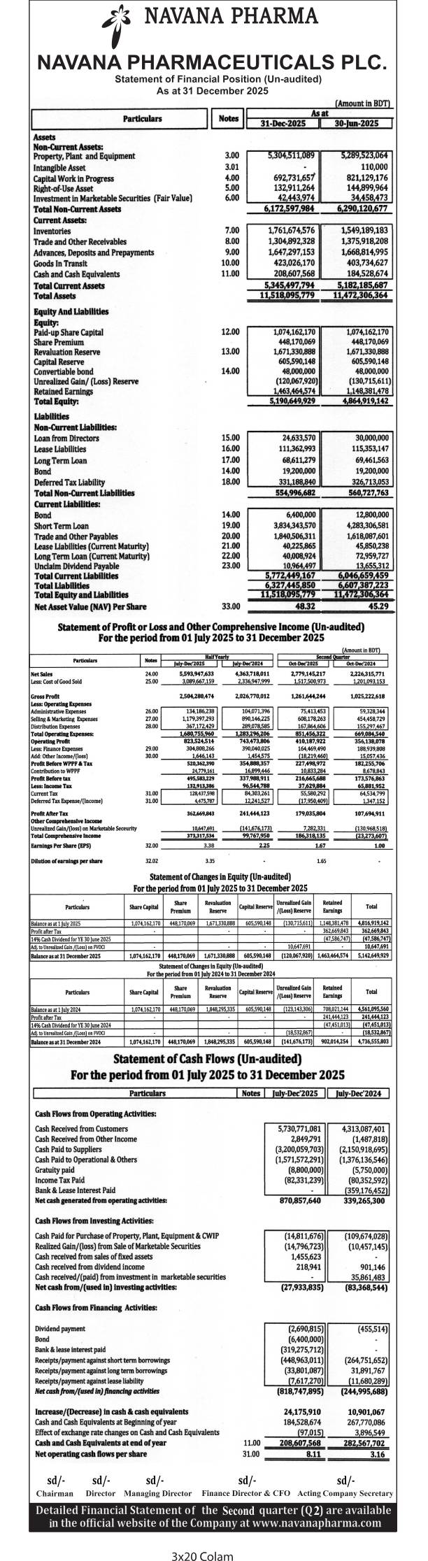 Statement of Financial Position (Un-audited) Navana Pharmaceuticals PLC প্রকাশ জানুয়ারি ২৮, ২০২৬, ১১:২০ অপরাহ্ণ শেয়ার